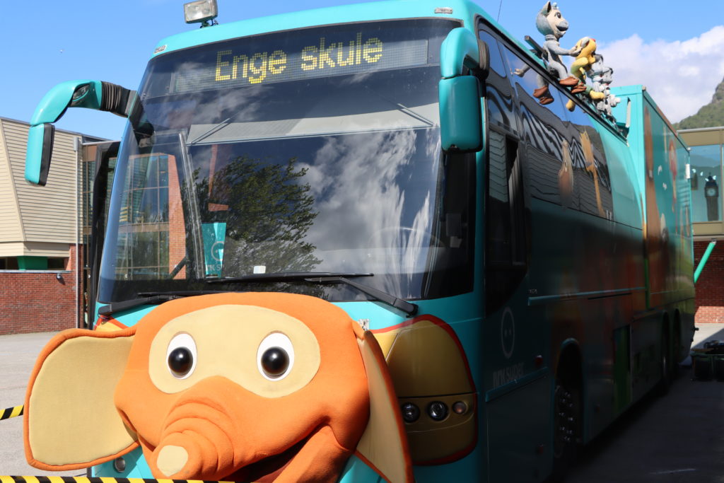 NRK Superbussen svinga innom Enge skule. FOTO: Irene Mæland Haraldsen