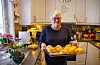 Inger Mari byr på rykande ferske solbollar. Oppskrifta heng på veggen bak henne, og dette kan ho.