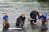 Havforskingsinstituttet utforskar laksen i Etneelva. Her er leiar av laksefella i Etneelva Per Tommy Fjeldheim (t.h.) saman med kollegane i Havforskingsinstituttet Kaja Christine Andersen Fjeldheim (f.v.),Paulas Rimas Petrauskasog William Aure Aannø ved eit tidlegare høve.