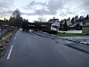 Ein lastebil står på tvers i Vikevegen, like ved Skjold bedehus i Isvik.