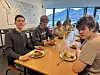 Viljar Rullestad Mæland (f.v.), Elias Selland og Marius Stølås Sævereid hadde relativt spontant bestemt seg for å få gratis middag, men angra ikkje.