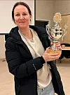 June Marie Hornenes viser fram vandrepokalen ho har fått for mangeårig frivillig innsats i idrettslaget.
